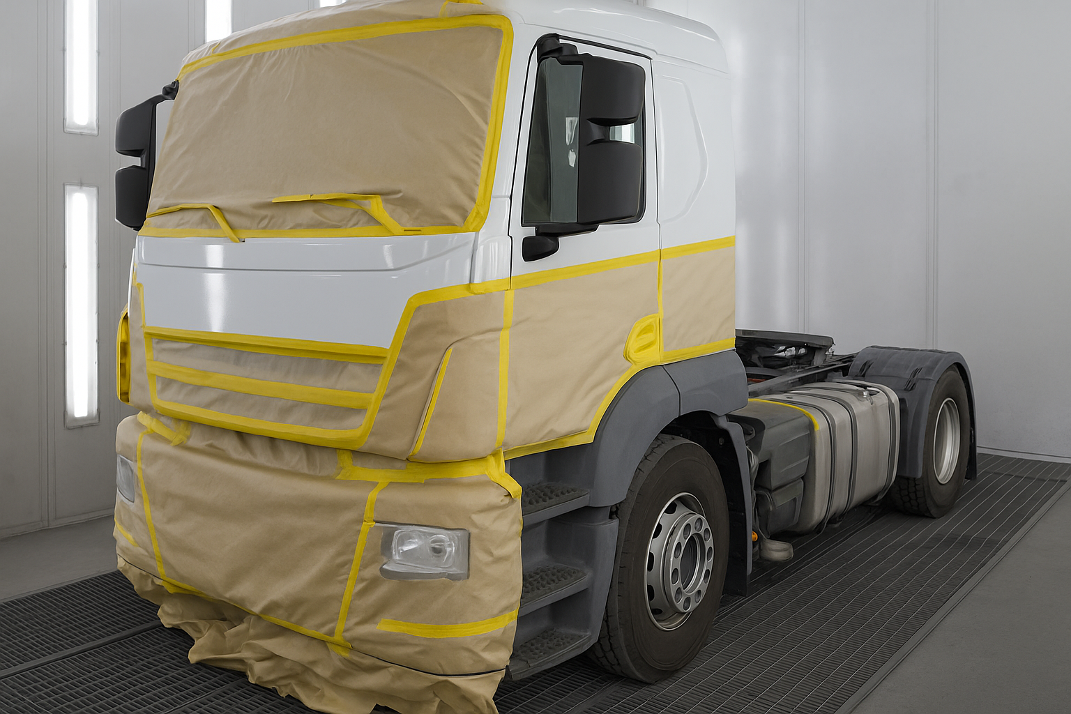 Ilustração sugerida: Imagem de um veículo pesado sendo mascarado antes da pintura.